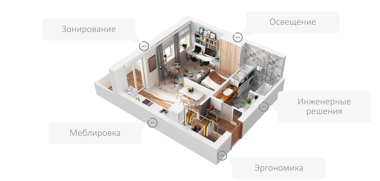 Обеспечим функциональность и технологичность за счет: систем «умный дом» и управления климатом, акустических и световых сценариев, экологичных, безопасных и износостойких материалов.