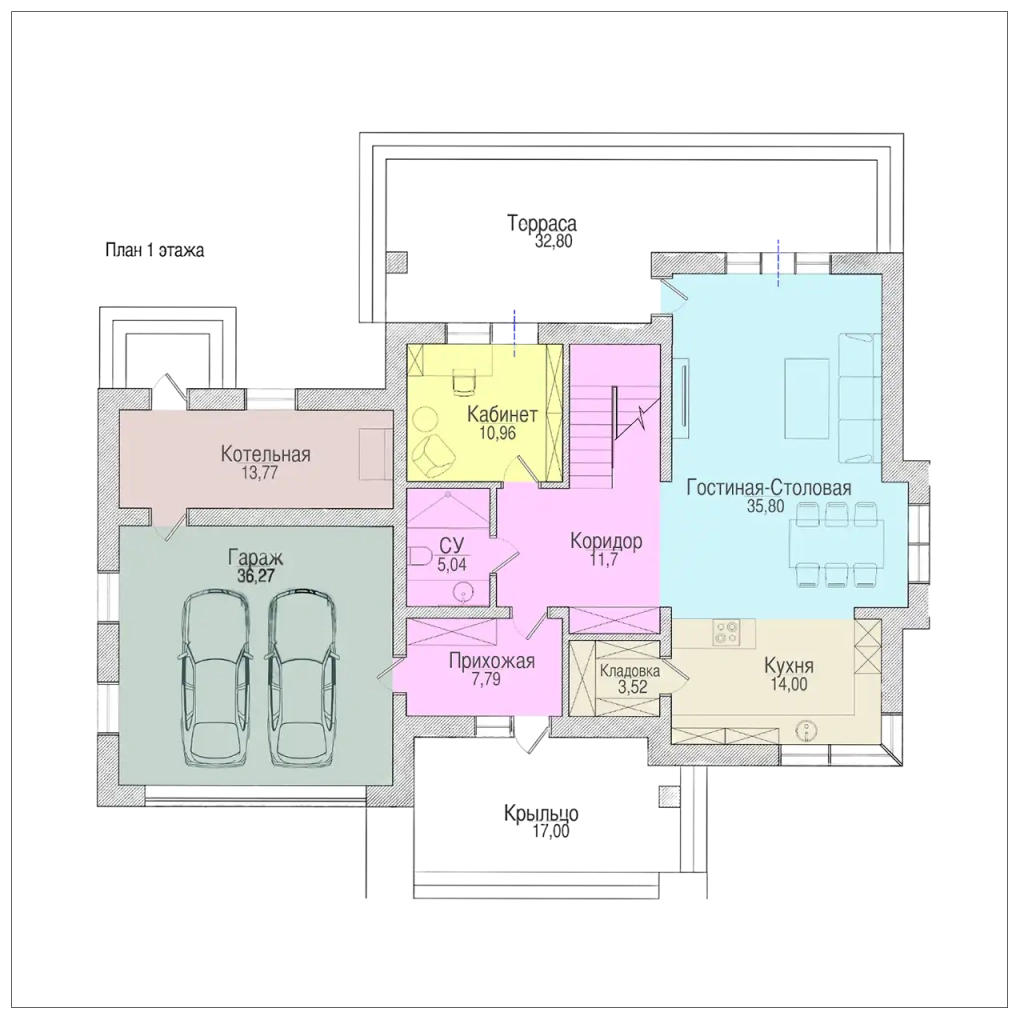| Пространства | Прихожая, кухня-гостиная, кабинет, гардероб, гостевой санузел, 3 спальни, 2 гардеробные, душевая с постирочной, мастер-ванная |