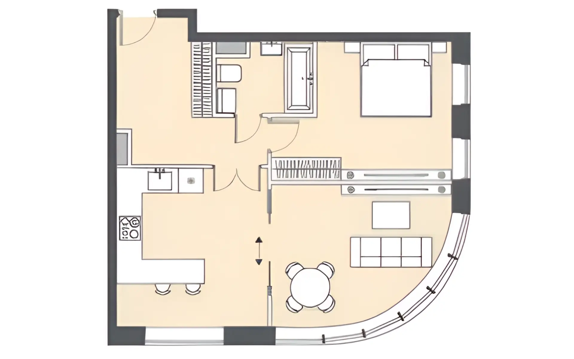 | Пространства | Кухня‑гостиная, спальня, детская, санузел, гардеробная, прихожая |